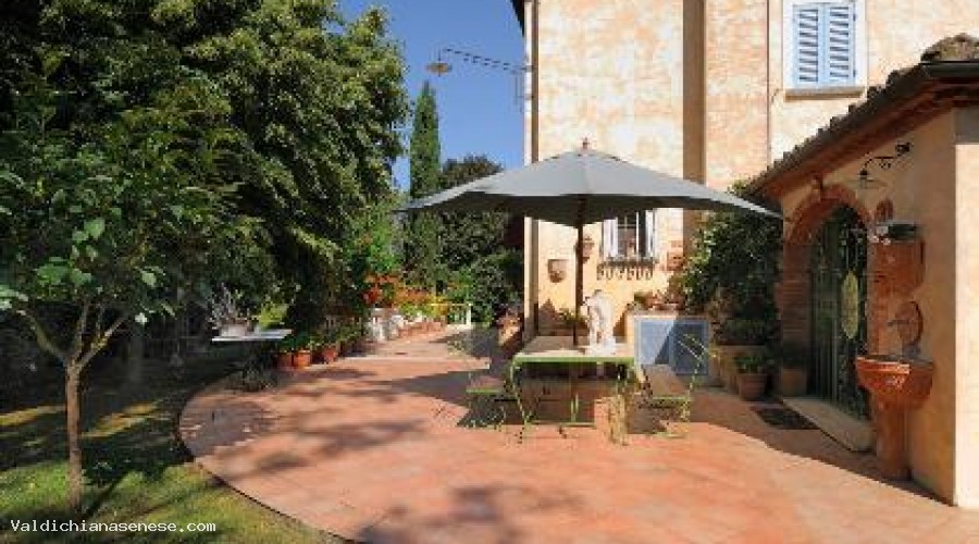 The guests also have the facilities of an external space where it’s possible to lunch and dinner in absolute tranquillity, in the unique atmosphere of a fabulous garden. The accomodation is particularly suitable to children and animal lovers.Situated in the heart of the sienese Valdichiana, in the middle of a game preserve, on the top of a hill from wich is possible to admire an ample view of the surrounding country-side, “Il Melograno” is an integral part of a very elegant country-house of the early XX century. Beautifully restored, is surrounded by an ample park rich in trees and flower beds. The house is situated few kilometres away from the major motorway Valdichiana exit, on the outskirts of the charming hamlet of Bettolle, in a strategic position to reach some of the most beautiful towns in central Italy such as Siena, Arezzo, Cortona, Perugia, Orvieto, Florence, Pienza e Montepulciano. In the proximity, there are a golf-course and riding grounds.