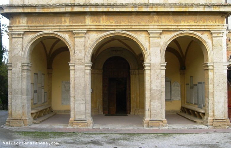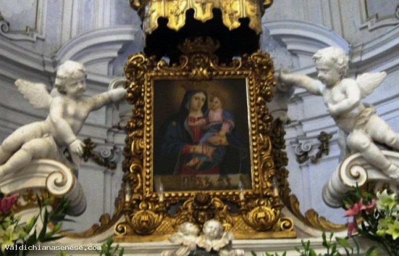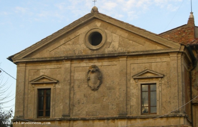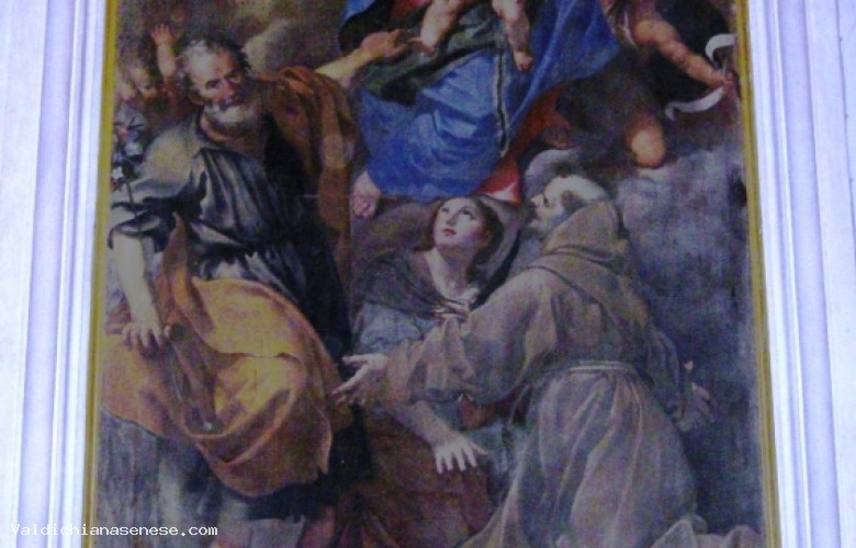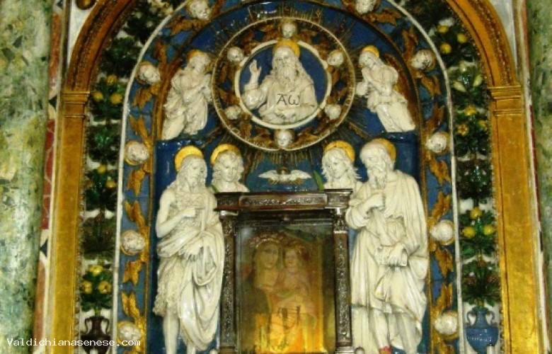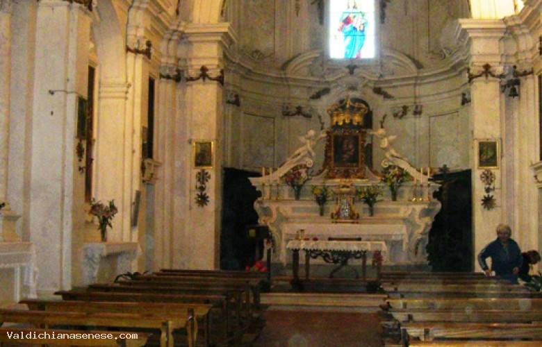 The facade of the church is preceded by a porch with three arcades ,executed, as the whole facade, following the project by Ippolito Scalza. The interior, with a single space, presents a decoration made of very rich gilded stuccos, dated 1700.A glassed terracotta attributed to Andrea and Giovanni Della Robbia is quite remarkable. It represents the Celestial Father with Saints and angels. It encloses a fresco, dated late 1300. It has at its sides two statues representing the Assumption and the Archangel Gabriel, made of glassed terracotta, probably executed by Dellla Robbia. On the third altar on the left, there’s located a canvas representing Saint Helen, executed in 1632 by Bartolomeo Barbiani. The organ with cypress pipes, dated XVIth and XVII,th century, inside an inlaid, gilded chest , dated 1700, is quite remarkable.