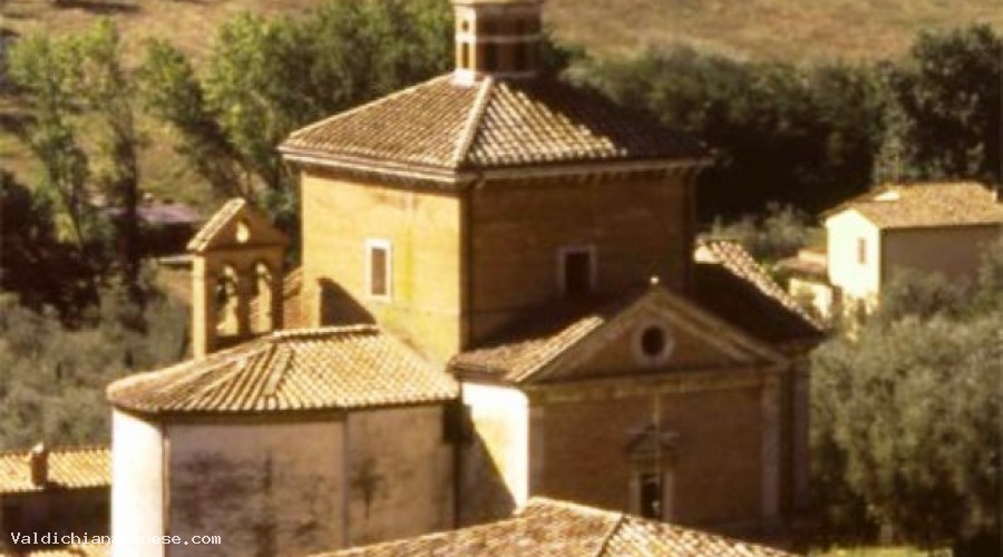 The building was constructed between 1585 and 1599. Baldassare Lanci from Urbino, creator of the complex , adopted a Greek cross plan. The classical style facade is very simple and the four arms of the church unite under a square dome cladding surmounted by a polygonal lantern. The church takes its name from the fresco preserved inside, where a “Madonna that offers a rose to the Child “ is represented. It’s been executed by a XV century Sienese artist .Another fresco, the so called “Madonna of the Prisons” is a Sienese work , dated 1300.Testo: Church of the Madonna of the Roses