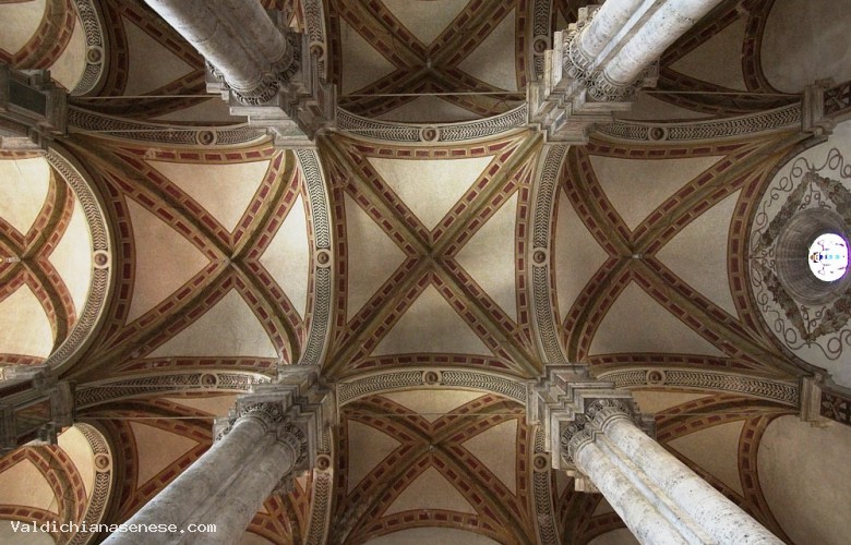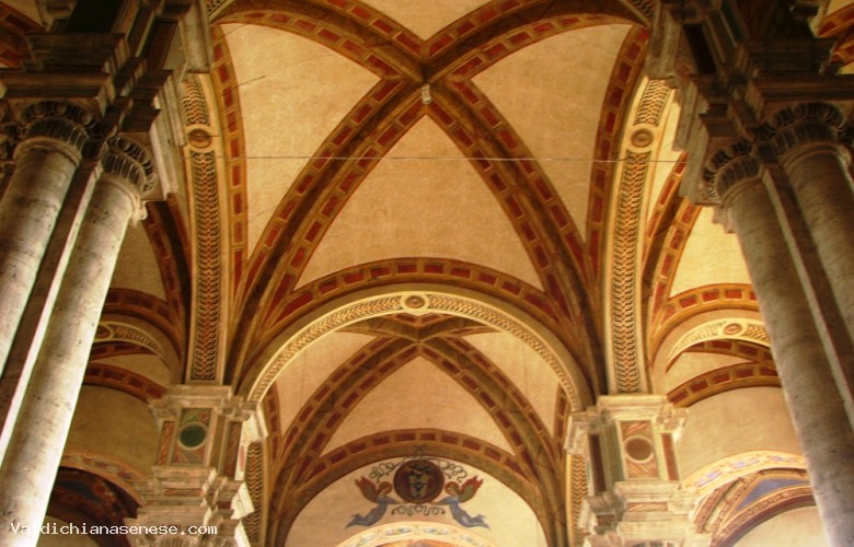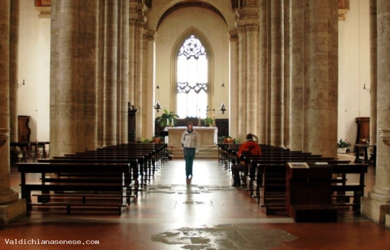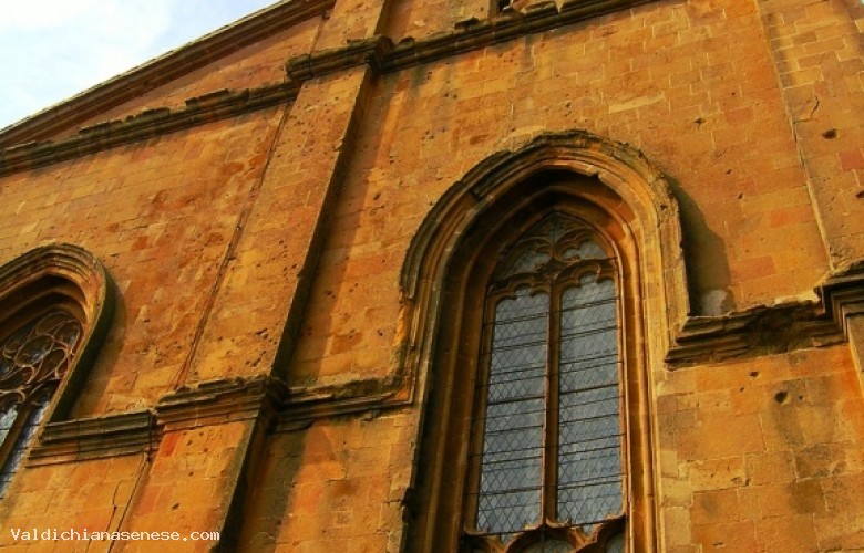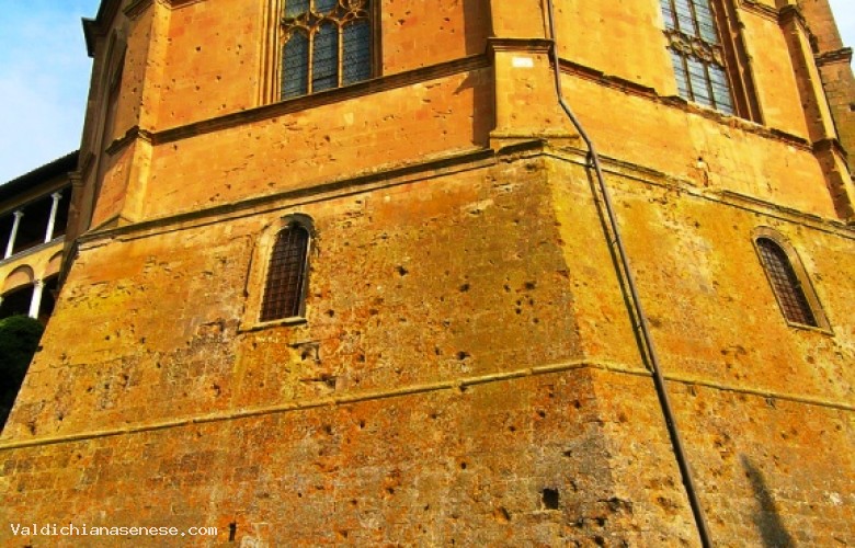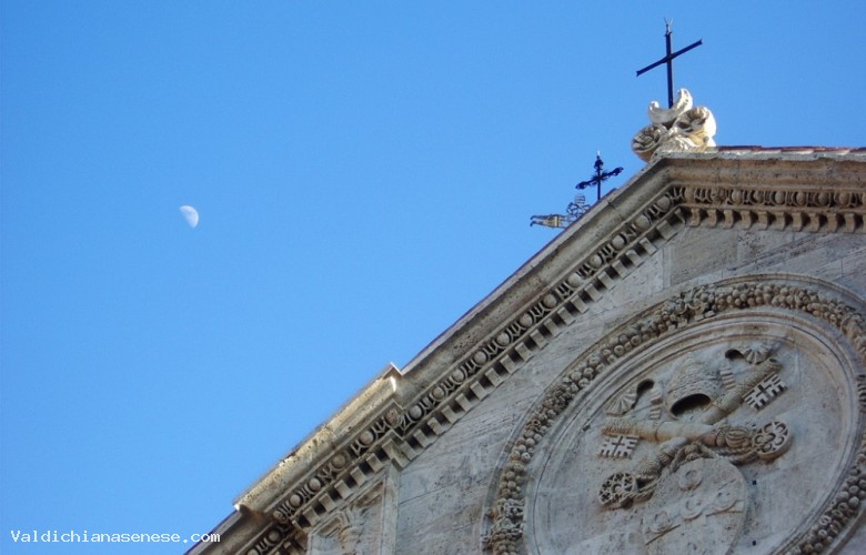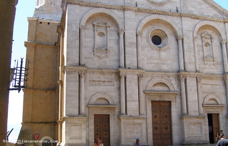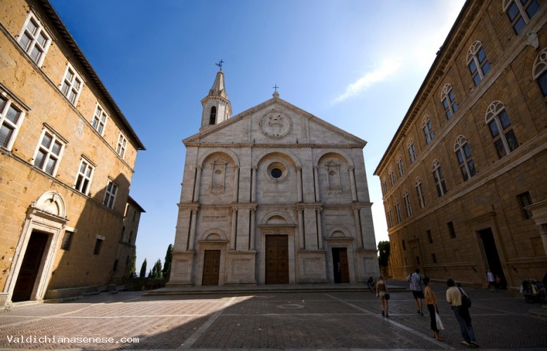 It was built by Rossellino in 1459. Dedicated to the Assumption, it was constructed on the ruins of the ancient Romanesque parish of Saint Mary. In order to have a large nave and a fairly large square, the apsis was anchored to the back of the hill, but not firmly enough to render it resistant on the unstable damp ground . As a matter of fact the restoring works on the sprone of the building that looks out on the countryside, have been very difficult and they’ve taken a long time. The exterior, clearly influenced by the architect Alberti, has a travertine facade, opened by three portals and divided in three sections by large pilasters flanked by two files of columns with a rose window and crowned by a tympanum with the code of arms of Pius II in the center. The bright interior, made up of three naves, similar in height, that Pius II had admired during his voyages in Northern Europe, links itself to Gothic motifs with the long and slender bundle pillars surmounted by tall imposts, on which stand the Gothic vaults. The ray apsis is lighted by the round windows, ornamented with thorny arabesque motifs. The bell tower with an octagonal plan, stands over the ancient crypt, it juts out on the left of the church and protrudes itself towards the sky ending with a beautiful gable. Among the artworks inside the Cathedral, we’d like to point out some altar panels, all similar in size and realized especially for the Cathedral , between 1461 and 1463, by some of the major Sienese artists of the time. The crypt houses sculpture fragments from the pre existing Romanesque Church of Saint Mary and a baptismal font by Rossellino’s shop.