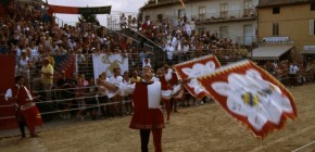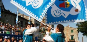 La contrada bianco-blu è situata su di una ripida erta che guadra la Valdichiana e ...