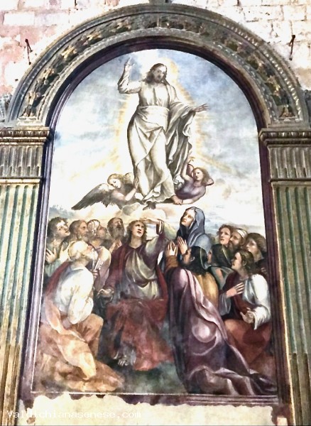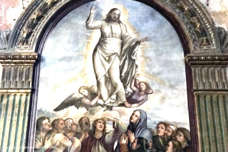 Questa scena presenta un dettaglio curioso perché, secondo la tradizione cattolica, l'Ascensione di Cristo avvenne senza alcun aiuto esterno, a differenza di tutte le altre ascese miracolose al cielo, in cui gli angeli, in numero variabile, sollevano la sacra figura e la trasportano in alto. Qui, almeno due angeli sembrano aiutare Cristo nella sua Ascensione.