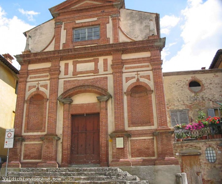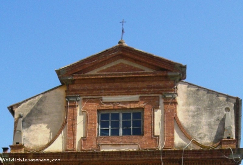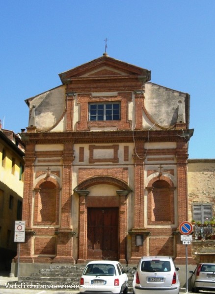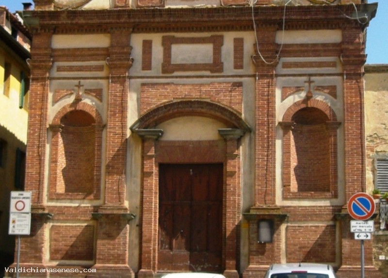 It has a single nave and a gabled roof. Its plaster facade is animated by decorative brick elements: four pilasters that terminate in a large molded frame enclose a portal with two niches. The central pilasters, that extend to the upper counterpart, terminate in a triangular spandrel and enclose a large rectangular window. On the roof, there’s a brick bell tower . The interior is characterized by precious stucco decorations, among which there are six statues of Saints. On the main altar, there’s a XVIIth century painting representing Jesus nailed on the Cross by Giovanni Antonio Cerretelli. The altar on the right preserves a panel representing the Nuptials of the Virgin by Luca Signorelli’s shop.