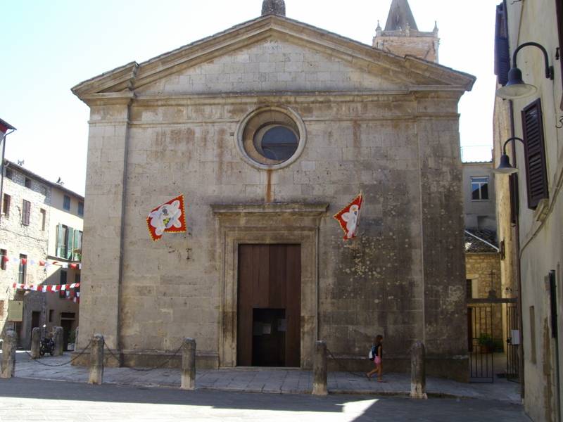 It dates back to early XIIIth century. It was restored and enlarged in the XVIth century. It was promoted to Cathedral in 1638. The interior was restructured in 1787. In 1955, it was declared Marian Sanctuary. It has a Renaissance facade and a Latin cross plan. The lateral altars are enriched with “The Baptism of Jesus” and “The Entrance of Jesus in Jerusalem”, by Sienese School, dated XVIIIth century . Behind the major altar, there’s a wooden choir by a Sienese artisan shop (1513). In the chapel of the Holy Sacrament, there are the beautiful tabernacle and the marble ciborium by Lorenzo di Mariano, nicknamed Marrina (1514) . In the chapel of Buonconsiglio (Good Counsel), there’s a “Madonna of Buonconsiglio” by Francesco Bonichi (1761), and on the sides, there are two arched panels with “The Messenger Angel” and “The Annunciation” by Girolamo del Pacchia (about 1514).