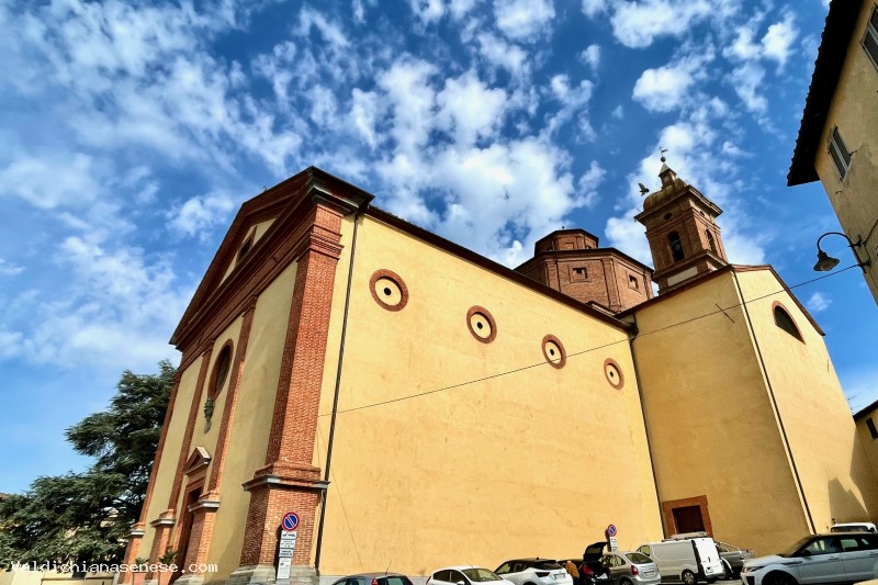 Eretta dal 1588, ha la facciata tripartita da quattro grandi lesene su cui si innesta il timpano triangolare, elementi decorativi realizzati a mattoni, come anche la parte terminale del campanile a torre e il tiburio ottagonale.