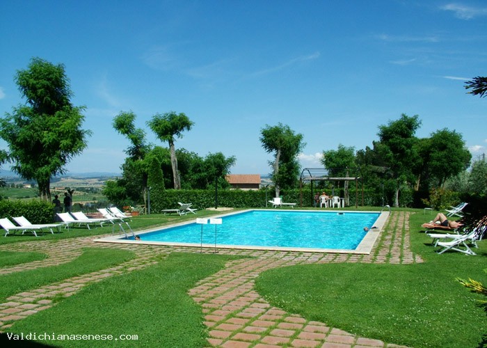 Nel verde del prato si inserisce la piscina scoperta, corredata di sdraio, lettini e tavolini.
