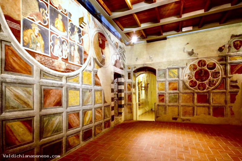The room, located on the first floor of the building, is among the works of enlargement of the building carried out at the turn of the thirteenth and fourteenth centuries. The great room, which was probably used to study commercial and administration of local justice, presents a colorful decoration faux marble accompanied, in the upper part of the walls, a rich sequence of coats of arms. Within this system decorative decorative, fit three large medallions with figures: Round of Aristotle - The largest of the three paintings on the north wall of the room, is the starting point of the illustration illustrations. There stands a half-bust of Aristotle, identified by a cartouche with. The picture is surrounded by the four Cardinal Virtues (Prudence, Justice, Fortitude and Temperance) and four sides by historical or mythical figures who, in their stories, are an example of the virtues themselves. These are now seriously damaged as well as most of the inscriptions. In quatrefoil below, is depicted a man pointing a hand ax and regent in the background a tower. SSI is certainly a symbolic reference to the town of Asciano. The scene as a whole is intended to enhance the common good that should be the main goal of those who manage the power, as Aristotle teaches, and that is achieved by good behavior, especially in terms of justice. Round of Solomon - The medallion to the left of the "Round of Aristotle" depicts the biblical story of the Judgment of Solomon, enlightened by divine wisdom. The scene shows two mothers who had given birth on the same days and lived in the same house, and that, following the death of one of the two children, they accused each other of having exchanged their dead son live with. Solomon, to prove who the real mother would have divided in half with his sword the child is depicted identifies the natural mother, recognized that in order to save his son, he asks the king to hand begging the other woman. Round of Nebuchadnezzar - Ilprimo Dream of Nebuchadnezzar, narrated by Daniel the prophet, is rappresentatoAlla the right of the "Round of Aristotle." The episode, from the Old Testament, showing what appeared to the king in a dream: a large statue with the head of gold, chest of silver, its belly and thighs of bronze, its legs of iron, its feet partly of iron and partly of clay, is destroyed by the fall of a large boulder. Nebuchadnezzar was troubled by a dream, he summoned all the wise men of Babylon, and condemned them to death because they are unable to interpret the meaning of the dream. Only Daniel, was able to explain to the king that the dream anticipated the fall of his kingdom and the coming of the Kingdom of God in this sense, the Dream wants to mean an example of Christian condemnation riches and greed of those who govern, because destined to an inexorable fall. The iconographic representation continues into the east wall with a spectacular classical Rota Barlaam.