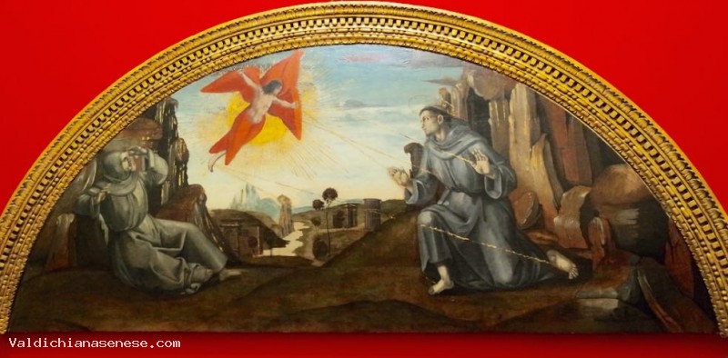 The lunette depicting St. Francis receiving the stigmata is dated around 1510-12, it is due to Luca Signorelli (Cortona 1445 ca.-1523). The scene is composed according to the dictates of St. Bonaventure's biography: the saint is kneeling before a wall of rocks, as his hands, his feet and chest are pierced by golden rays from a creature appeared in the sky, half Christ and Serafino half; at the opposite end is Brother Leo, companion of Francis on the Verna. The bezel comes as suggested by the subject represented, from the Church of San Francesco. For a long time it was considered that the table was the only surviving part of the 'closet commissioned to Luca Signorelli to protect the Golden Tree, but it has been shown that it is rather an altarpiece.