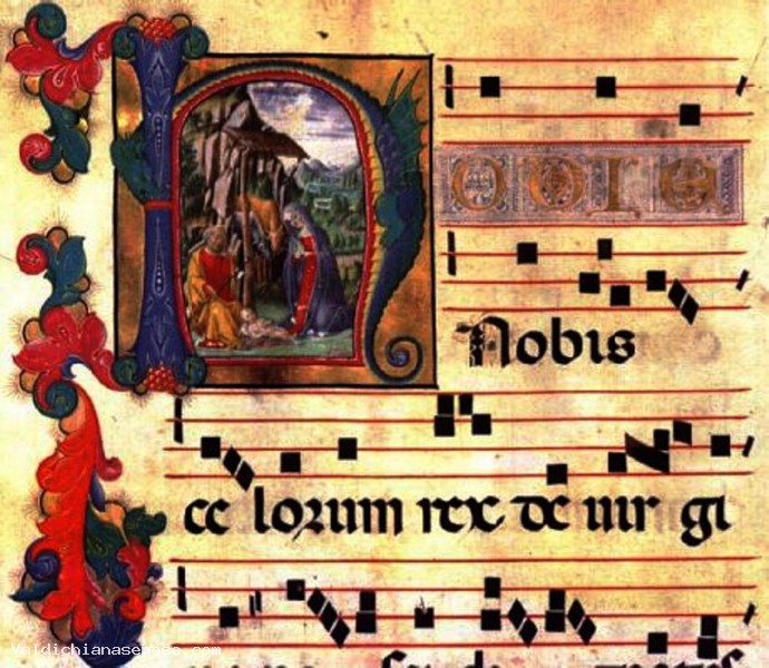 From here, one proceeds up to the narrow gallery , in which are exhibited twenty one ancient manuscripts from Monte Oliveto Maggiore, Abbey that was part of the diocese of Pienza , led by Bishop Giuseppe Pannilini, who was also bishop of Chiusi. The prelate, that had become the owner of the precious volumes, following the Napoleonic suppressions, donated them to the Cathedral of Saint Secondiano in 1810. The chorales were stolen at the end of 1987, but they were fortunately found after a month and they were placed again in their original location on June 25th, 1988. The chorales were commissioned , in 1456, by Francesco della Righiera, Abbot General of the Olivetan Order (found by Bernardo Tolomei , ordained in 1344, while its founder was still alive), in order to endow the monastery with a complete chorales cycle, composed by thirteen antiphonaries, a psaltery, four graduals and a kirial gradual. The copying of the volumes, countersigned by initial letters, are attributed to the monk from Monte Oliveto, Alessandro da Sesto Milanese and his shop. Alessandro was a famous calligraphist, but also a pen miniaturist, that is , he was the author of the filigreed initial letter , decorated with red or blue ink, where the parchment peeks through the empty spaces .Other initial letters are attributed to Friar Bartolomeo from Ferrara and to another fellow brother, Ambrogio from Milano. Also Friar Bartolomeo di Boniforte from Vimercate ,a calligraphist and a filigreed artist, contributed to the decoration of the chorales volumes. A few of the most famous artists of the time were called to realize the “brush” miniatures up to 1490. Among these , stand out the Sienese Sano di Pietro, that worked in the monastery from 1459 to 1463 and the Florentine Bartolomeo d’Antonio Varnucci, whose presence is not recorded but it can only be presumed analyzing the painting style. The most conspicuous amount of work, numerically speaking , is attributed to Venturino Mercati, a miniaturist educated in Lombardia, and still attached to a style coming from a Flemish – Burgundian and Ferrara tradition . The other Masters that have worked on the chorales volumes of Monte Oliveto were less attached to the late Gothic culture and they seemed more projected towards the Renaissance: Liberale da Verona ( seven mini and several leafy initials are attributed to him); he worked on them around 1466; Gerolamo da Cremona realized only one minium in 1472, while one presumes that the participation of Francesco di Giorgio Martini is limited to his shop. The gallery of the chorales takes us to the rooms ,that were opened in 1992 in the Episcopal Palace, to host works from the diocese of Chiusi: the origin of the incomplete table representing a Madonna with Child seated on a throne with Saint Giacomo and Saint Andrea on each side, attributed to the Sienese painter Girolamo di Benvenuto is unknown; whereas a Madonna with Child seated on a throne and attributed to the same artist comes from the church of Saint Francis in Cetona. On the major altar of the same church there was a small canvas representing a Madonna with Child, attributed to Sano di Pietro. The painting is dated between 1455 and 1460: considering its small dimensions, it’s difficult to hypothesize its original use, but one could presume that it was destined to private devotional purposes and that it was later placed in a silver frame ,dated 1600 and manufactured in a Roman goldsmith shop. In 1806, a pedestal was added to the frame. A table representing a Madonna with Saint Mustiola and Saint Felice (or Ireneo): already attributed to the shop of Sodoma, it’s been lately attributed to the Sienese painter Marco Bigio, character of vague biographical aspects. The subject of the painting induces us to presume that it comes from the Cathedral of Saint Mustiola and it reminds us of the partially legendary Passion of the Saint, characterized by the flagellum, in this case made of a club from which come out three ropes ending with three lead balls, with which the young noble lady was whipped to death. The other saint represented is either identified as the martyr Felix, buried by Ireneo, or as the same Ireneo. It’s definitely Saint Felix , who is depicted on another canvas, in front of an idealized view of Chiusi. The touching sculpture of Christ Crucified , made of polychromous wood, dated between the XIVth and XVth century, comes from the Parish of Macciano: it was used both as a cross and also for the exposure during the Holy Week. In the middle of the room are gathered , in a show case, important goldsmith’s pieces: an altar cross , dated early 1400, that shows Christ on the recto and the Virgin and Saint John, Magdalene and the pelican on the terminal cusped spaces ; the versus shows the Blessing Christ and the Evangelists ( the inferior part is missing). A “stauroteca”, that is one of those reliquaries destined to preserve the fragments of the “Real Cross”, and that followed its shape, was originally preserved in the Cathedral of the Holy Trinity in Cetona. On an inscription appears the year 1436. Lately it’s been suggested , since it bears close analogy to the Cross in the Museum of the diocese of Pienza, that the artist is probably Goro di Ser Neroccio. On the versus there are simple stones and miniatures added during the XVIIth century. A gilded copper tabernacle door had already been used for the marble niche on the altar of the Cathedral of Saint Lawrence in Sarteano, created in 1514 by Lorenzo di Mariano, nicknamed Marrina. The project of the tabernacle door, later terminated by a Sienese goldsmith , can easily be attributed to Marrina. On the inferior part, there’s an inscription with the date of the execution of the tabernacle and of the person that commissioned it; the canon of the cathedral of Siena, Francesco Pilli, that wanted the crescent moon repeated on the elegant work, in reference to the code of arms of the Piccolomini Todeschini fa