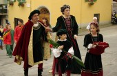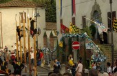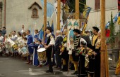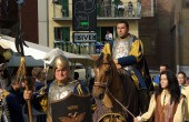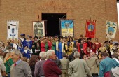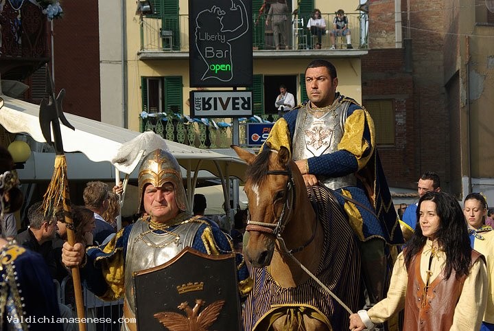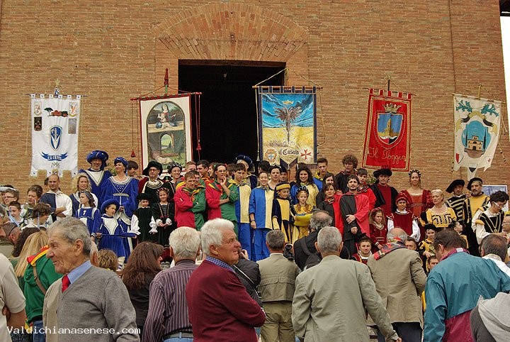 La rievocazione storica si apre con il corteo composto dai figuranti di ciascuna delle cinque contrade (MONTEMAGGIORE, LA CEPPA, IL CASATO, IL POGGIO, LE CASELLE) e dal carro della Pro-loco; tale corteo sfila per le vie cittadine secondo un ordine a suo tempo sorteggiato ed il tempo di sbandieramento è uguale per tutte le contrade.