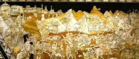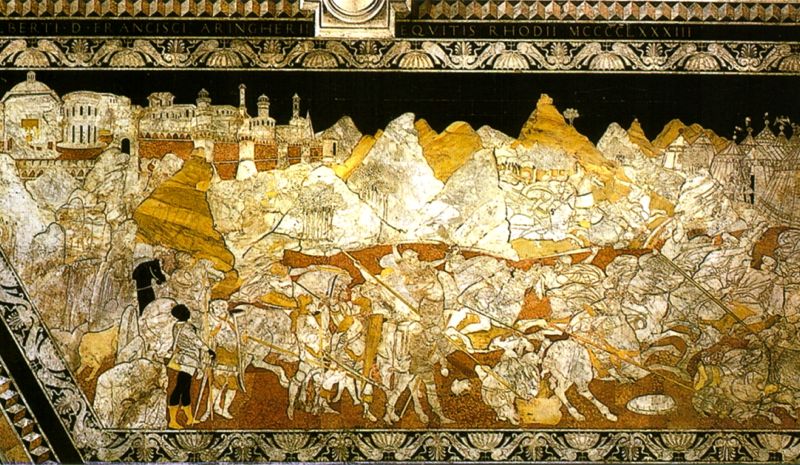 The story of Jephthah is told in the Book of Judges (11, 29-40) and this is framed by an elegant frieze of dolphins addressed, shells and palmettes. Against the background of an extensive landscape with a walled city at the top (from which protrude buildings typical of the Renaissance), mountains and a military camp of the battle between the troops of jew judge Jephthah and the Ammonites. On the left Jephthah with his horse, dressed as a Roman emperor, gives orders to his men, and next to him you see an elegant combination of two young soldiers in conversation. In the background is part of the city victorious Jephthah and meets his daughter, foreseeing the sacrifice that God had promised in exchange for victory. In the temple a central plan, in the upper left corner, then sacrificial scene takes place in fulfillment of the vote. The box was paid from 1481 to 1485 at the stonemason Sebastian Francis, design attributed to Urbano da Cortona or Neroccio of Bartolomeo de 'Landi. Many details have been defined as "neoattica harmony" as the momentum of the horses in battle, or how to present the dark warrior in the foreground, details related to a taste archeologizzante that flourished in Siena at the close of the fifteenth century. Up to 1661 this section of the floor stood before the door of forgiveness.