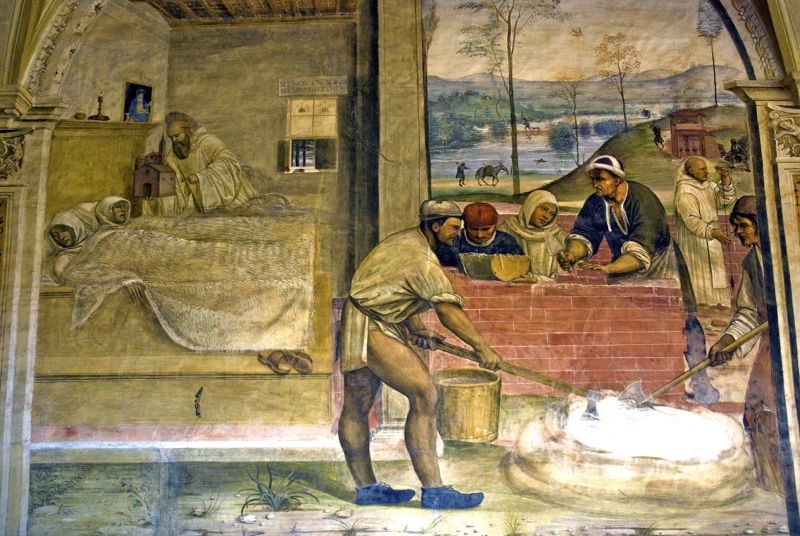 The scene takes place in two phases. On the left, the saint appears in one of the monks sleeping while on the right work is done.
