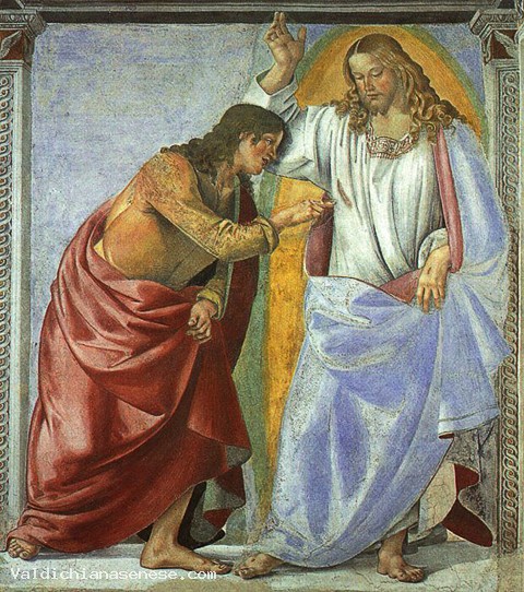 Sulle pareti, nel registo superiore, si trovano le scene della Conversione di san Paolo sulla via di Damasco e dell'Incredulità di san Tommaso, oltre a cinque coppie di Apostoli affrontati. Nell'Incredulità la fisionomia di Cristo è un po' rubiconda e paffuta, quasi identica a quella che si ritrova nello Stendardo della Flagellazione.