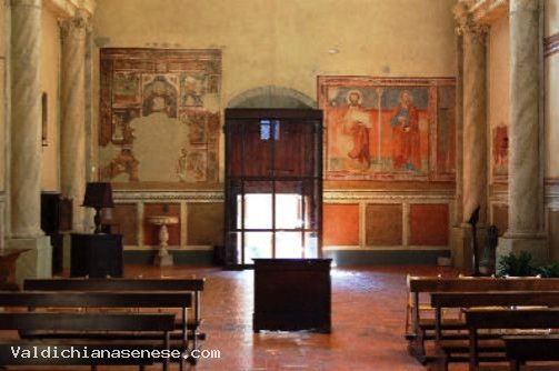 It was built in the second half of the XIIIth century ( on the bell the year 1292 is engraved) according to Romanesque-Gothic architectural canons, that is with a Romanesque cross plan (the classical T shape with a single nave). Inside, lies hidden a small museum made up of various XIVth and XVth century Sienese frescoes, among which one is quite remarkable ,to the point that the church is worth visiting even if only to view such artwork: it’s the colossal figure of Saint Christopher by Niccolò di Segna (XIV). Furthermore, inside the church, there was a Madonna with Child by Lorenzetti. Only the copy is now visible, since the original is housed in the Museum Diocesano in Pienza. Aside from the above mentioned fresco, by Segna, the church also hosts the following artworks: Left hand side of entrance : Saint John Evangelist and Saint Bartholomeus by a Sienese painter(XIII) Left hand side of nave: Saint Nicholas and Saint Cosma and Damien (XIV) Left hand side of nave: Madonna with Child by Sienese painter (XIV) Left hand side of nave: Madonna with Child by Niccolò di Segna (XIII) Left transept: Saint Christopher – Wooden Sculpture (XV) Left transept: Wooden Crucifix (XIII) Left hand side of Apse : The Confession ( Lorenzetti School XIII) Apse : Saint Christopher by Niccolò di Segna (XIII) Apse: Saint Leonard by Niccolò di Segna (XIII) Apse: Tabernacle – Grating by Pietro Betti (1313) Apse: Crucifix Right hand side of nave: Oath of the Vicar by a Sienese painter (XIII) Right hand side of nave: Life of Saint Catherine of Alexandria by Niccolò di Segna (XIII) Right hand side of nave: Madonna with Child and Saints (XV) Right hand side of nave: Saint Peter by Niccolò di Segna (XIII) Right hand side of nave: Holy Water Basin (XIV) Left hand side of nave: Bell (1292) Right hand side of entrance: Blessed Gherardo from Villamagna by a Sienese painter (XIII)