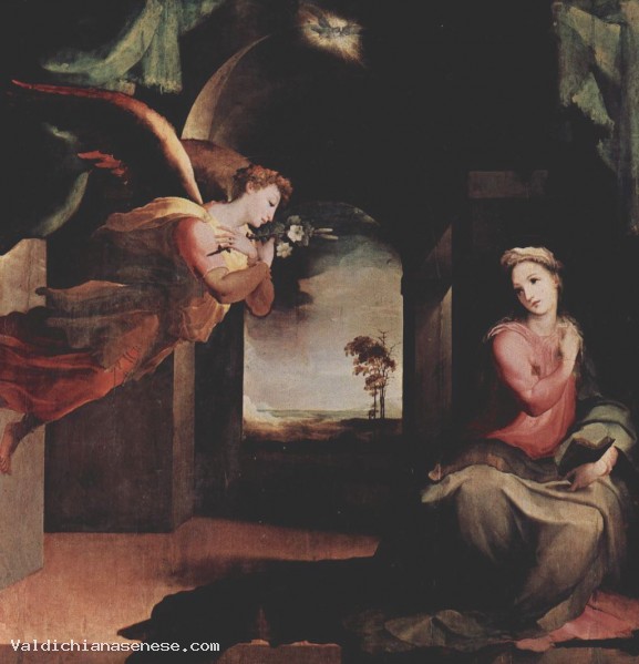 The present church has the facade of travertine and brick with columns and Doric capitals. A nave, contains two paintings on wood by Jacopo di Mino del furrier, a Madonna and Child known as the Madonna of the Goldfinch (1344), and an altarpiece dedicated to the Madonna delle Grazie; an arched panel by Andrea di Niccolò with the Madonna and Child with Saints Rocco and Sebastiano (second half of the fifteenth century); the celebrated Sarteano Annunciation by Domenico Beccafumi (about 1545); the Visitation of the Virgin to St. Elizabeth of Matteo Rosselli (first half of the seventeenth century |); the Madonna and Child in glory and Alessandro Casolani saints (last quarter of the sixteenth century).