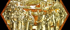 Hex center you can see the figure of King Ahab and Elijah left to right, surrounded by two symmetrical wings of characters. The figures are tall and slender, with fine clothes, especially the royal has turban, wide sleeves and fur seals. Elijah is pointing to a hill where there is a tree dried up due to drought and where they are dragged two oxen to sacrifice: one will be offered to Baal and the other by his priests to God of Elijah, so that the king, in the presence of all the people can see what true worship is and what a dummy (I Kings, 18, 17-19). In the background you can see the walls of the city. This was the last hex to be executed by Beccafumi, whose payment was made ​​June 18, 1524. In this marquetry artist modules scenes footage of the fifteenth floor, using a sky of marbles blacks.