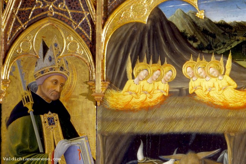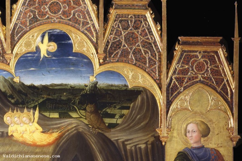 Next are depicted Saints Augustine, holder of the order to which he belonged, the church to which it was intended the painting, and San Galgano which is recognizable by the attribute of the sword in the rock, which hints the move away from the knight life to follow that of a hermit.