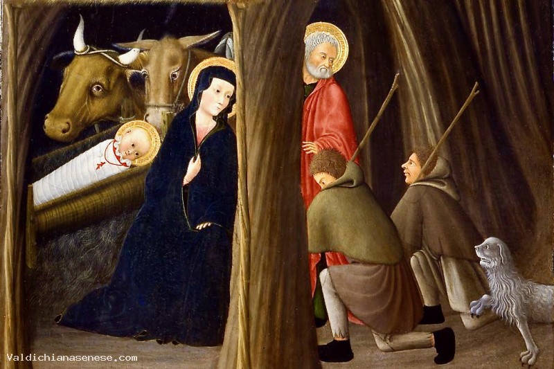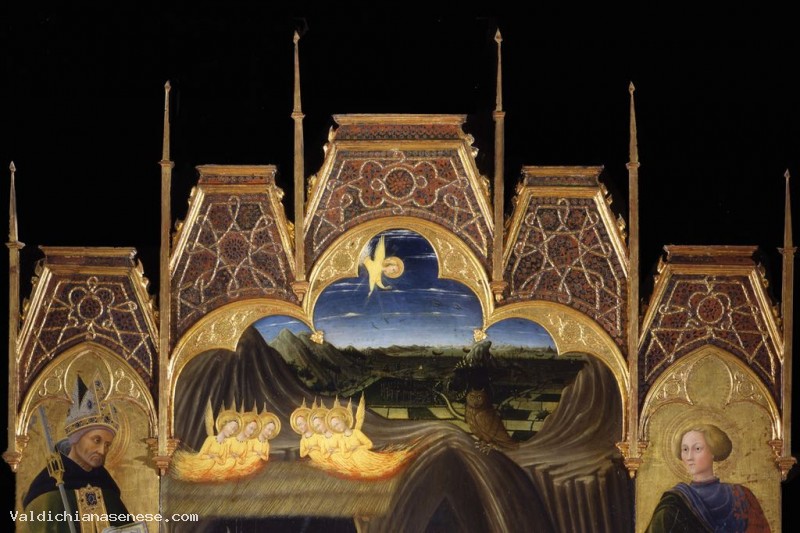 The painting presents the type of fourteenth-century blades depicting the patron saints of the Cathedral of Siena: the structure is in triptych with the central narrative scene, flanked by two saints. In the middle we can see a fresh Nativity, similar to the one painted around 1351 by Bartolomeo Bulgarini for the altar of the Cathedral of St. Victor and of which a fragment in the United States, at the Fogg Art Museum in Cambridge.