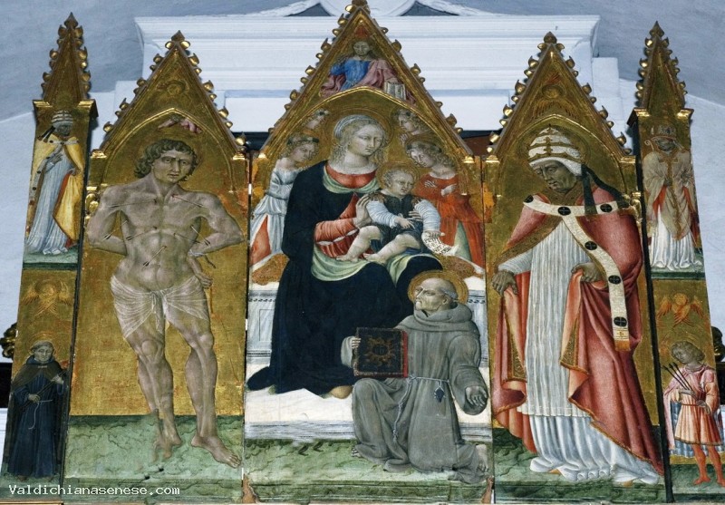 The Church also preserves the Polyptych by Giovanni di Paolo di Grazia (1399-1482), the remarkable fresco of the Madonna and Child enthroned and the saints Catherine of Alexandria, Mary Magdalene, Giovanni Battista, Bernardino da Siena, by the Umbrian painter Bartolomeo da Miranda from 1449, the fresco of the Ascension by Giovanni Antonio Bazzi known as Sodoma.