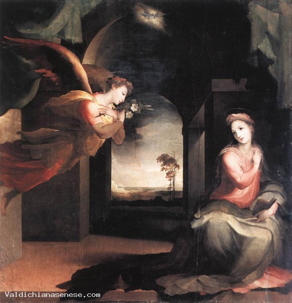 l'Annunciazione di Sarteano (237 × 222 cm), riconosciuta al Beccafumi solo nel 1932 ma di alta qualità cromatica e luministica. è l'ultima testimonianza della pittura su tavola dell'artista, fortemente influenzata dalla conoscenza michelangiolesca della Cappella Sistina, per la monumentalità classica delle figure inserite nell'ambiente in penombra a contrasto con lo stupefacente brano di paesaggio lacustre sul fondo