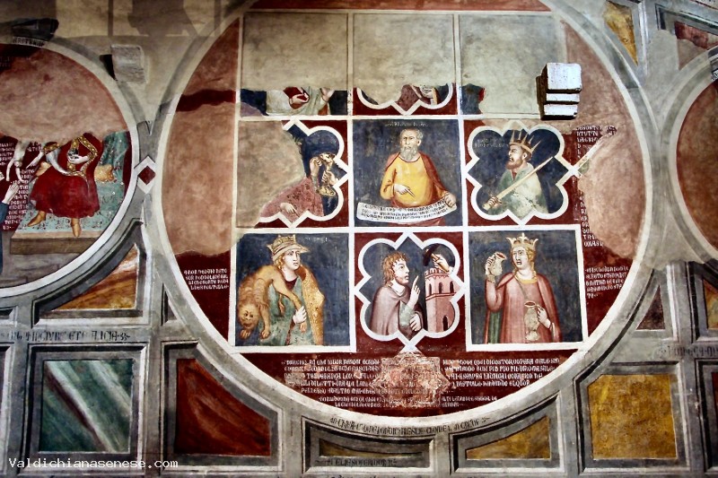 La sala, situata al primo piano dell'edificio, è tra le opere di ampliamento dell'edificio realizzate tra la fine del XIII e il XIV secolo. La grande sala, probabilmente utilizzata peresercitare attività commerciali e amministrare la giustizia locale, presenta una  decorazione a marmo colorato accompagnato, nella parte superiore delle pareti, da una ricca sequenza di stemmi. All'interno di questo apparato decorativo, trovano spazio tre grandi medaglioni con immagini corredate di scritte. La Ruota di Aristotele - Il più grande dei tre dipinti sulla parete nord della stanza, è il punto di partenza delle decorazioni illustrative. In mezzo alla ruita troviamo il busto di Aristotele. L'immagine è circondata dalle quattro Virtù Cardinali (Prudenza, Giustizia, Fortezza e Temperanza) e ai quattro lati da figure storiche o mitiche, esempio delle virtù stesse.