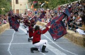 Durante questa giornata il paese viene imbandierato e abbellito con attrezzi tipici di San Casciano dei Bagni. La contrada del Campanile con i sui colori bianco verdi e come stemma il campanile della chiesa di San Leonardo, il giorno del Palio nella bellissima piazza della repubblica rievoca il mercato della stoffa e organizza la corsa dei sacchi. La contrada della Porticciola con i colori giallo e rosso e come stemma la vecchia porta del paese rappresenta il vecchio lavoro del vincaiolo ed organizza il gioco della pentolaccia. La contrada del Pozzo con i colori bianco celeste e lo stemma il pozzo che troverete centro della piazza della contrada rappresenta il vecchio lavoro del fabbro e organizza il gioco del ruzzolone. La contrada del Gattineto con i colori giallo e nero e come stemma la scalinata con un gatto che porta nel cuore della contrada rappresenta il vecchio lavoro della filatura della lana ed organizza il gioco del palo della cuccagna. La domenica che precede il palio le contrade delimitano i propri confini con le rispettive bandiere e comincia l'attesa, si può già notare che tutti i contradaioli sono in fermento. Arrivato il giorno del palio il paese è addobbato con cura dando l'impressione di un borgo rinascimentale, alle ore 16,30 tutti i figuranti delle contrade si ritrovano all’interno del castello per formare il corteo storico. Il corteo storico formato da tamburini, guardie, giudici,stendardi, dame, cavalieri e sfidanti ben allineato e composto si dirige verso l'antica porta del paese in Via San Cassiano dove il porta voce del Magistrato porge in nome di esso un saluto a tutte le contrade e l'autorizzazione ad entrare dentro le mura paesane. A questo punto il corteo si dirige verso la chiesa di San Leonardo, dove il Parroco effettuerà la benedizione del palio e il Magistrato farà giuramento ai capitani. Il Magistrato accenderà una fiaccola in ogni contrada significando che la sfida può cominciare. La prima sfida è "la corsa dei sacchi", la seconda "la pentolaccia", la terza "il ruzzolone" ed infine "l'albero della cuccagna". Ogni gioco assegna al primo classificato quattro punti al secondo tre punti al terzo due punti e al quarto un punto, la contrada che al termine di questi giochi si trova al primo posto avrà un riconoscimento dal'organizzazione e potrà partire dalla riga di partenza nella "CORSA DELLA RANOCCHIA" mentre gli altri avranno una penalizzazione arretrando il proprio punto di partenza in relazione al punteggio conseguito nei quattro giochi.