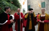 Nasce così il Palio di San Cassiano. La festa si svolge la domenica precedente la festa di San Cassiano (13 agosto), patrono di San Casciano. La manifestazione ha inizio con la formazione di un corteo, composto dai rappresentanti delle contrade (capitani, tamburini, armati, giocatori, dame e cavalieri) tutti in costumi rinascimentali, che, percorrendo un tratto dell’antica strada che collega San Casciano alle Terme, giunge alla Porta di accesso al paese e qui riceve, dal Gran Ciambellano del Magistrato, il permesso di entrare all’interno delle mura. Giunto sul sagrato della Collegiata di San Leonardo, il Corteo si ferma e qui il Magistrato raccoglie il giuramento dei Capitani delle Contrade, mentre l’Arciprete benedice il Palio. Inizia così la visita del Corteo alle Contrade, in ognuna delle quali il Magistrato accenderà una torcia come segnale dell’inizio dei giochi.