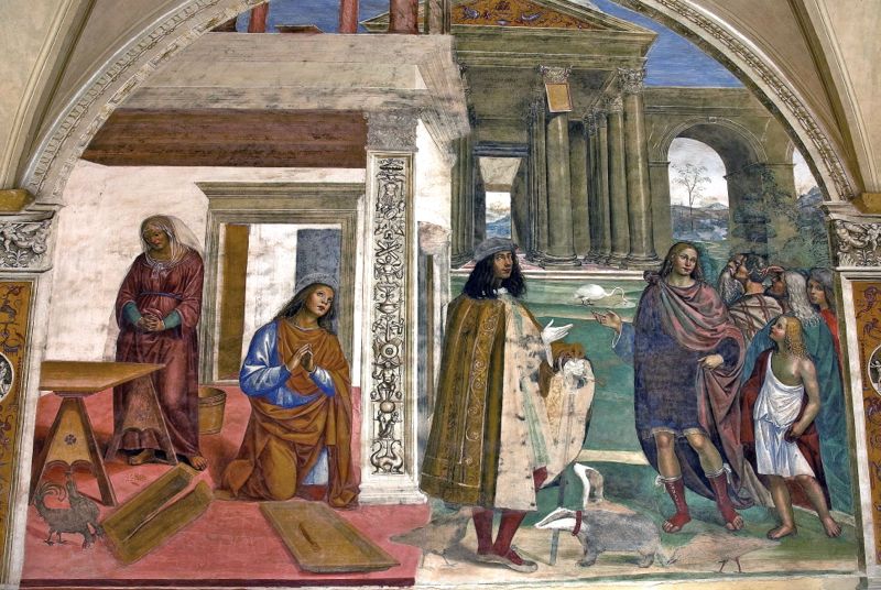 San Benedetto ottiene che il capisterio (un vaso in legno) caduto alla nutrice si ripari: sulla destra un gruppo di persone ammira l'oggetto rinsaldato e appeso a una colonna. Nel gruppo di persone il pittore ha ripreso i propri familiari e dipinto se stesso di fronte a loro in abito da cavaliere.