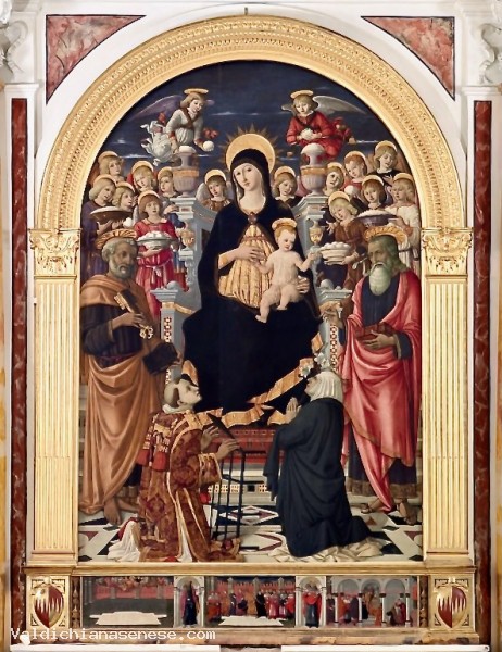Presenta la Madonna in trono col Bambino fiancheggiati dai Santi Pietro e Giovanni Evangelista e davanti ai Santi Lorenzo e Caterina da Siena.