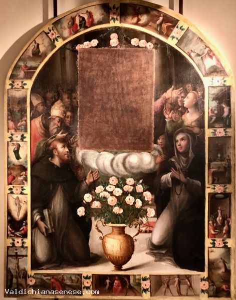 In addition to Saint Dominic and Saint Catherine in the central part of the canvas, there is a frame that runs throughout the painting, the sections of which are read starting from the one in the upper right and continuing clockwise.