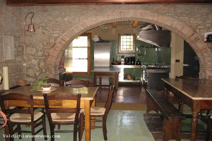 L'ampio salone arredato in stile è abbellito con dipinti rappresentanti soggetti rurali toscani, una stufa in ceramica, due ampi divani e una bacheca con i nostri prodotti che rendono il soggiorno caldo e accogliente.