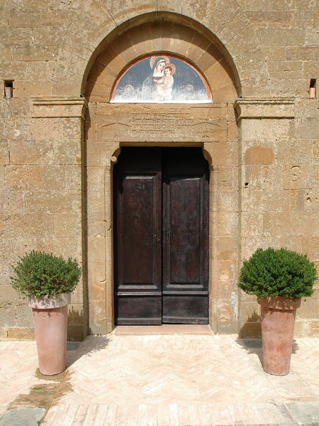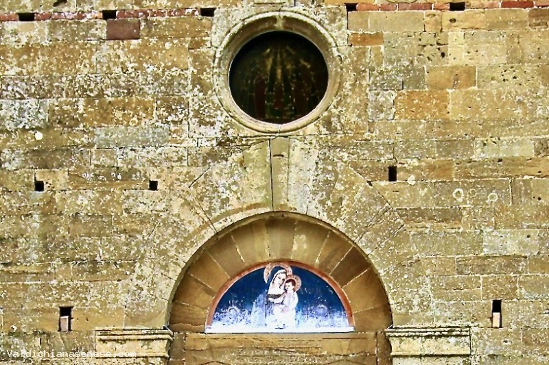 Sull'architrave è un'iscrizione racchiusa da due Croci di Malta - l'antico simbolo dei Templari -, mentre l'occhio è sormontato dallo stemma olivetano perché dopo la soppressione dell'ordine cavalleresco la Badia passò ai Monaci Olivetani.