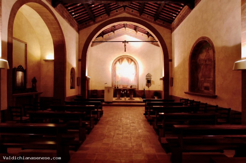Nell'interno, ad aula unica rettangolare con tetto a capriate lignee, si trovano due affreschi quattrocenteschi rappresentanti la "Madonna col Bambino e i Santi Pietro e Paolo e San Girolamo in trono e i Santi Sebastiano e Benedetto".