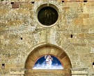 Sull'architrave è un'iscrizione racchiusa da due Croci di Malta - l'antico simbolo dei Templari -, mentre l'occhio è sormontato dallo stemma olivetano perché dopo la soppressione dell'ordine cavalleresco la Badia passò ai Monaci Olivetani.